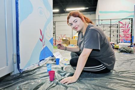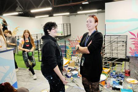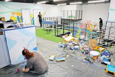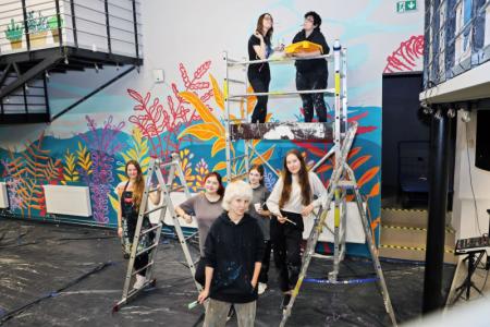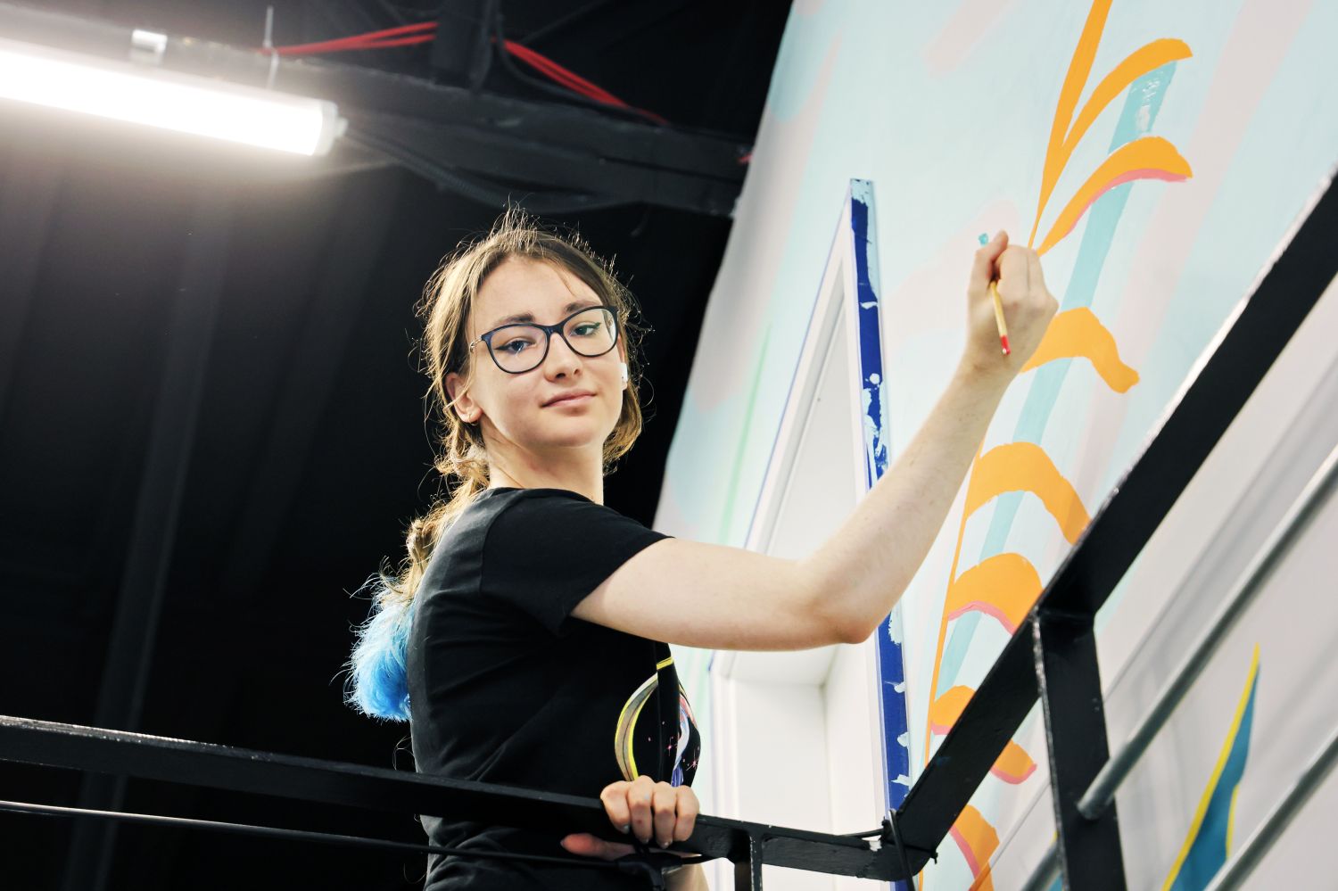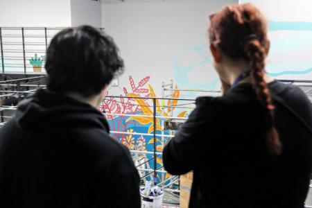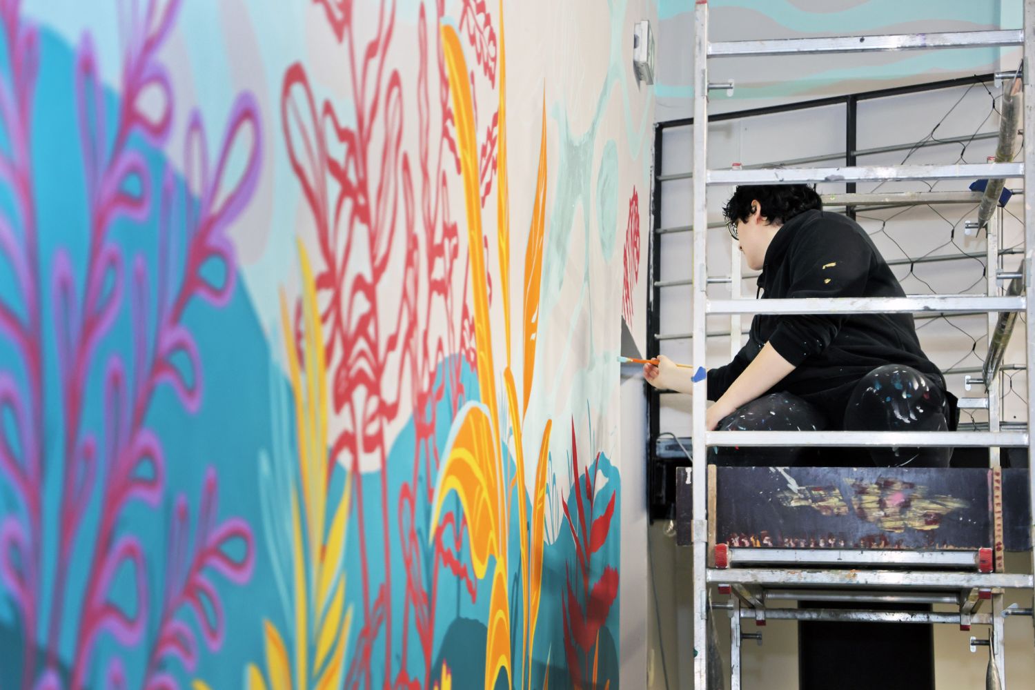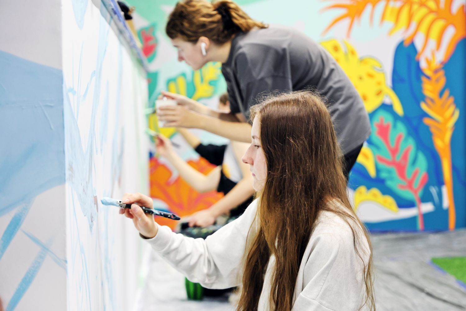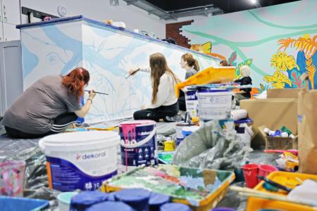 Wnętrze OAS „Kotłownia” nabrało nowego wyrazu – dzięki artystycznej aranżacji ściennych kompozycji, przestrzeń zyskała barwną, inspirującą oprawę. Główne motywy projektu to żywe kolory oraz stylizowane elementy roślinne, które razem tworzą dynamiczną i energiczną atmosferę.